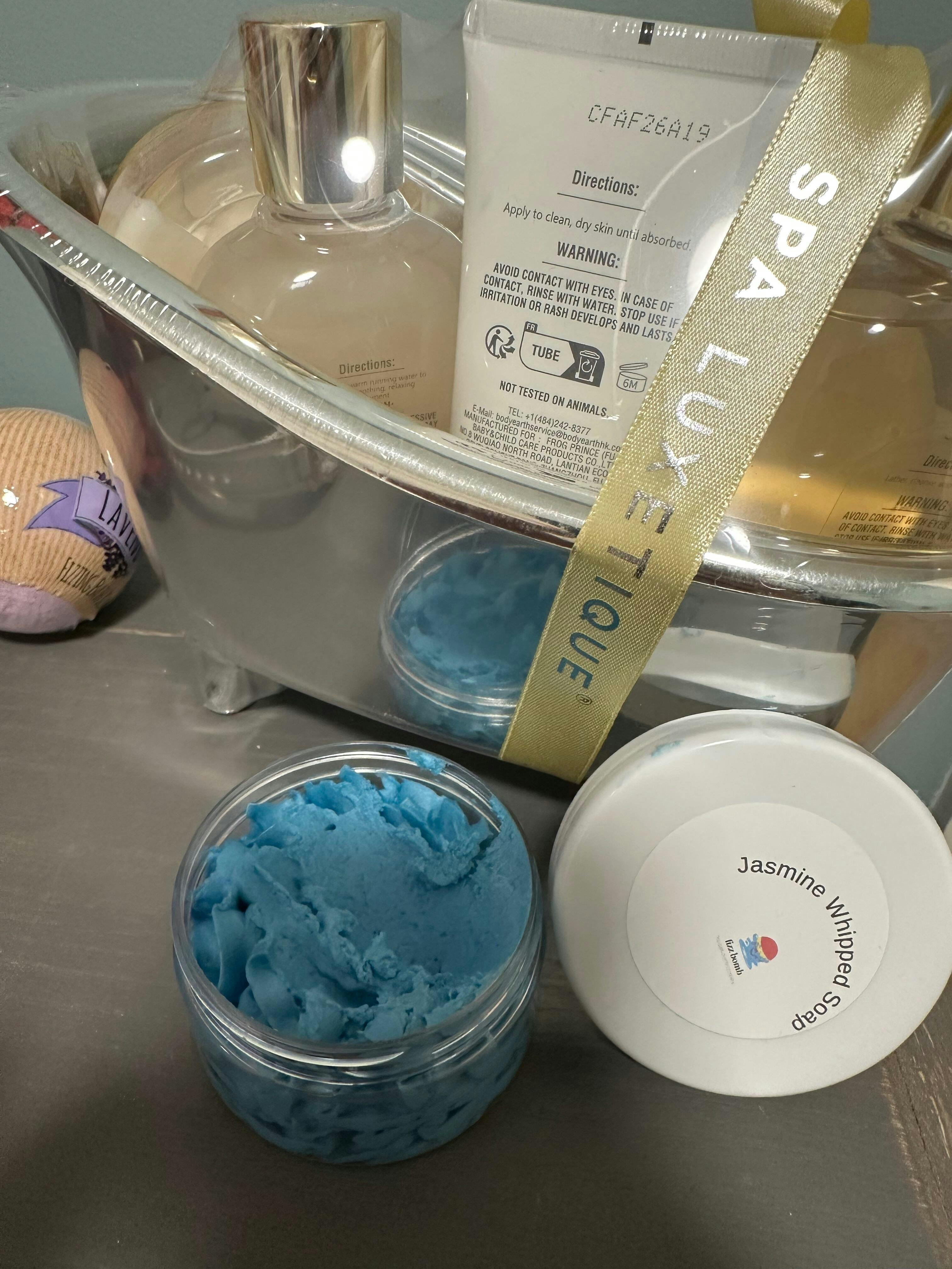 Indulge in our artisanal Jasmine Whipped Soap, meticulously crafted and hand-piped to perfection. This luxurious teal-hued creation combines the delicate floral notes of jasmine with a cloud-like whipped texture that transforms your daily cleanse into a sensory experience. Each bar is made from scratch using premium ingredients, ensuring a gentle yet effective formula that pampers your skin. The expert craftsmanship behind every batch guarantees a product of exceptional quality and distinction.